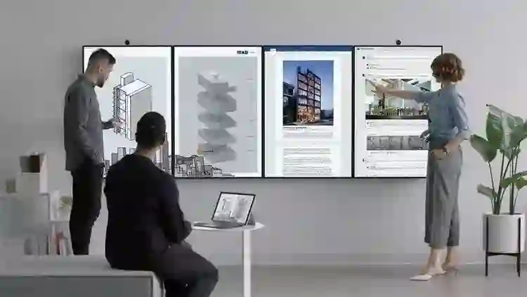 Surface Hub 2 最惊艳的一点,是当一块屏幕显示区域受限的时候,多台 Surface Hub 2 能够合并成一块更大的屏幕。微软允许将最多四台 Surface Hub 2 “串联”,每台设备上可以运行不同的程序,也可以共同显示一种内容,四块屏幕拼接时的显示效果令人震撼。