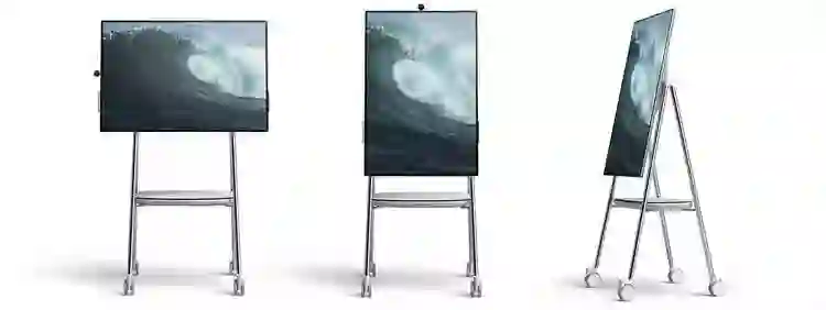Surface Hub 2 拥有一款 50.5 英寸且 4K+ 分辨率的屏幕,其纵横比为 3:2,横向竖向均可以操作。屏幕方面相比上一代有一定的缩小,但也收窄了边框,外形上来看更加精致。同时由于尺寸和重量的减少,Surface Hub 2 具有更方便的可移动性。因此它可以放在一个安装有滚动轮的支架上,或者干脆直接安装在墙上。