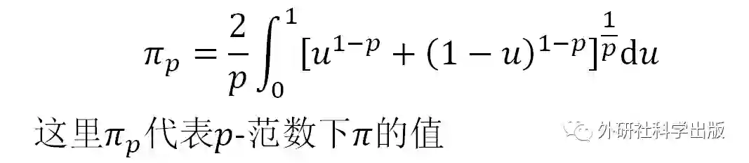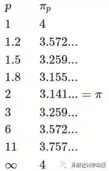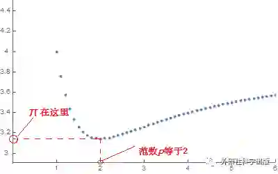 上面图像是范数p的取值与π关系。横坐标为范数p的取值,纵坐标是在不同范数的情况下“圆周率”的取值。图像是依据下面展示的公式绘制的。最后给出一组具体的数值供同学们参考。