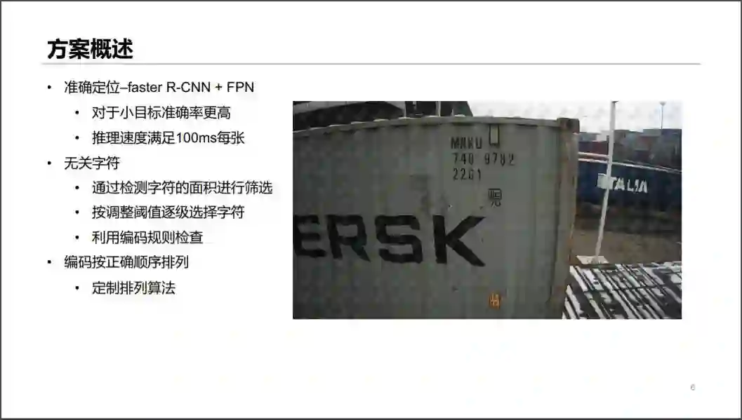 集装箱是水运运输中用到的非常多的一种容器,在港口理货环节,需要人力去识别箱号,增加了不确定及视觉局限的隐患,本实战项目希望能够通过OCR算法识别并输出集装箱号码,加快集装箱的核验速度,提高集装箱装卸效率,降低人为出错率。