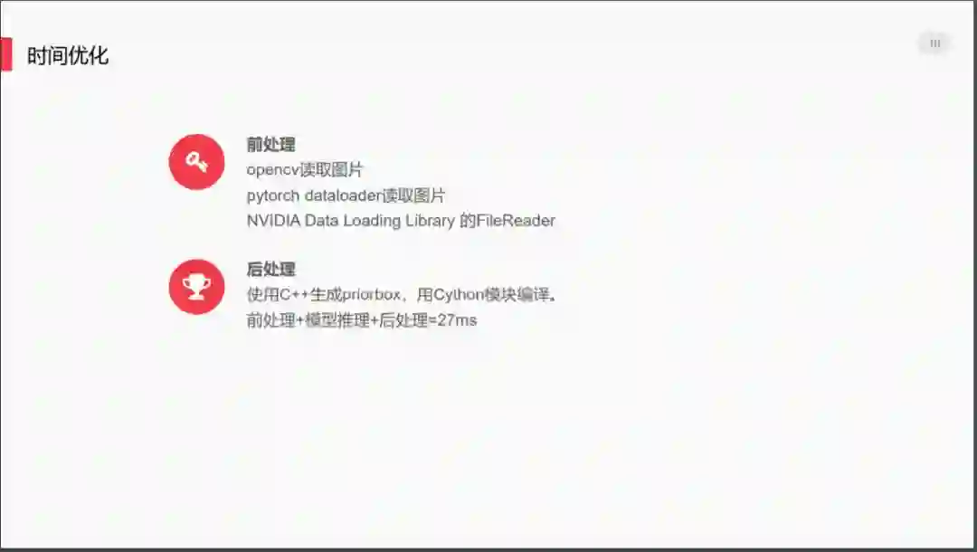 在时间优化上,郭广超同学尝试了比较多的方法,最终前处理+模型推理+后处理达到了小于30ms的速度,点击下方视频即可观看完整报告: