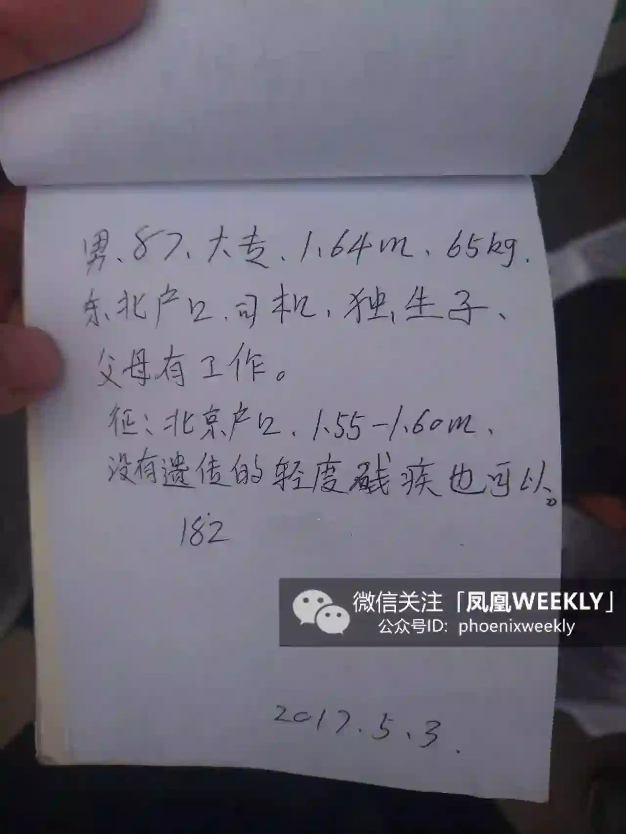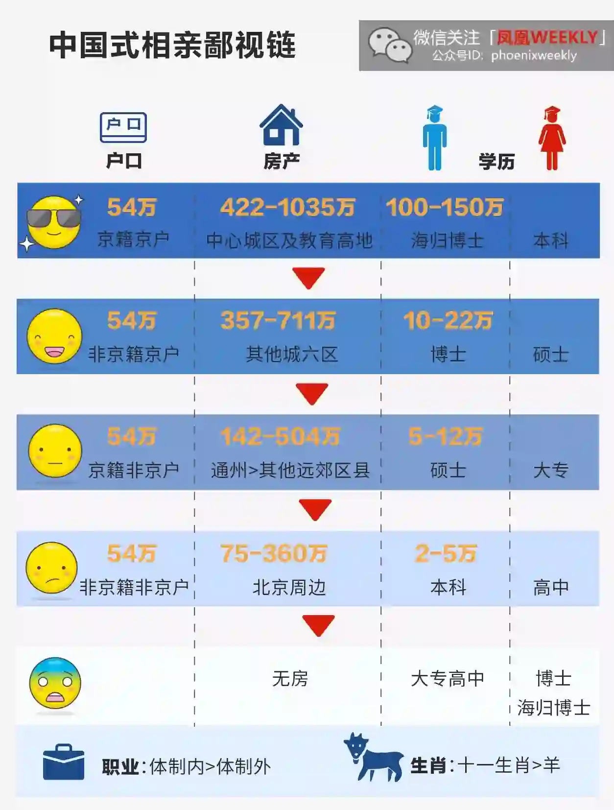 《中国式相亲价目表:我儿子才33,不考虑没北京户口的姑娘,有户口残疾也行》来源:凤凰WEEKLY 作者:费知