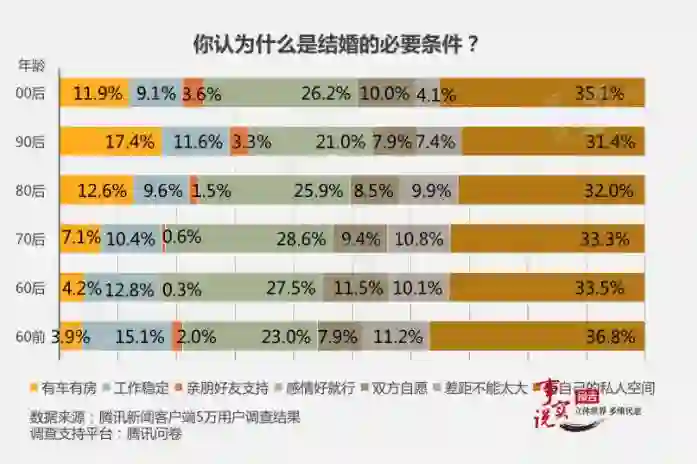 特别的是,90后在结婚时对房和车的要求明显比其他年龄层的人更为强烈,达到17.4%。