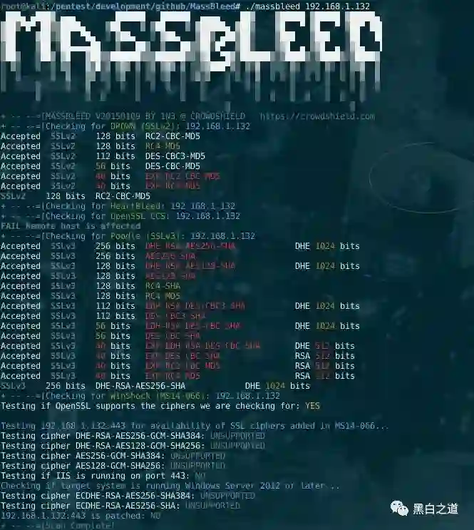 通过端口443 / tcp(https)(例如:sh massbleed.sh 192.168.0.0/16)大规模扫描OpenIDL漏洞的任何CIDR范围