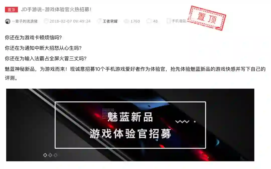进入 2018 年,魅蓝似乎也加快了产品发布的节奏,魅蓝 S6 刚刚发布不久,又有另一款全面屏的消息传出。2 月 7 日,京东社区就为魅蓝的新品发布了产品体验招募贴,透露魅蓝下一款新品将主打游戏性能。
