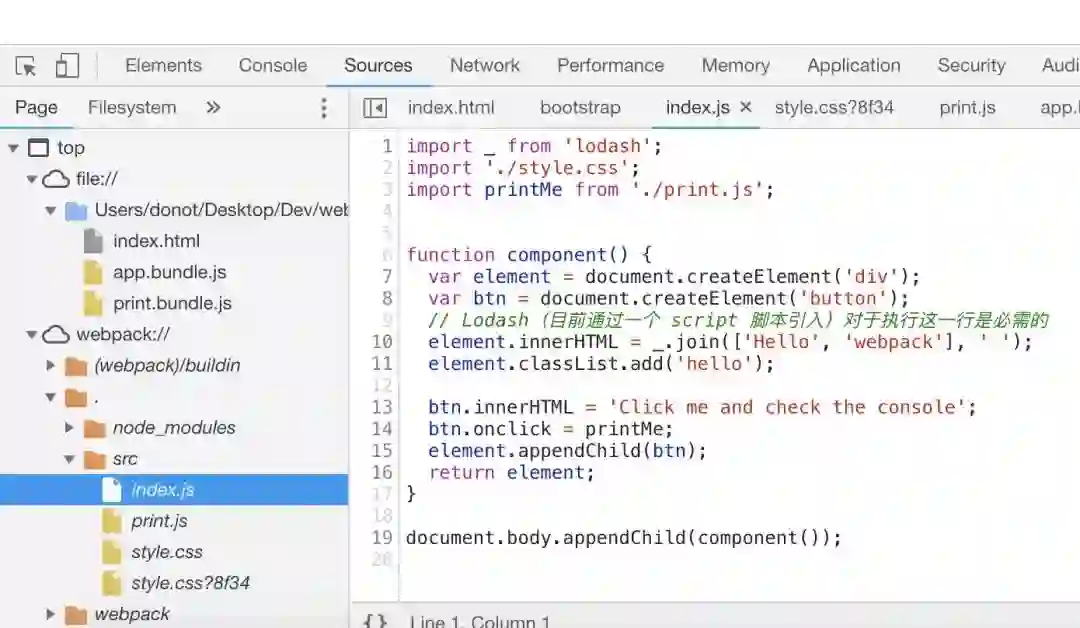 在VUE/REACT开发场景下 ,前端开发会引入如模块化等诸多新特性,前端开发不再是几个简单的js文件,开发完成后会通过webpack等打包工具打包生成部署使用的js文件,但是如果我们直接分析该编译的js,很难看懂。比如我这个demo:https://blog.donot.me/assets/demo/index.html,页面下的app.bundle.js反正我是看不懂写的是啥,这个js文件就是webpack打包后的结果,但是由于我是开启了source-map调试模式,如果你是用chrome浏览器打开的,打开devtools-sources,应该可以看到一个webpack://,这个就是chrome对source-map调试的支持,点开src目录下就可以看到js代码源文件。