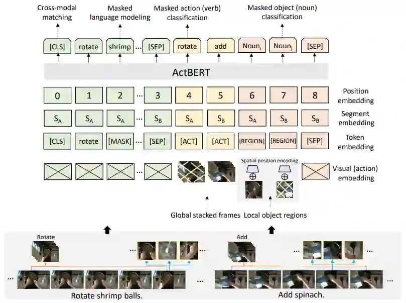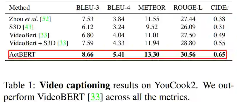 最后,提出四个训练任务来学习 ActBERT。预训练后的 ActBERT 被转移到五个与视频相关的下游任务,并定量地显示 ActBERT 达到了最先进的性能。