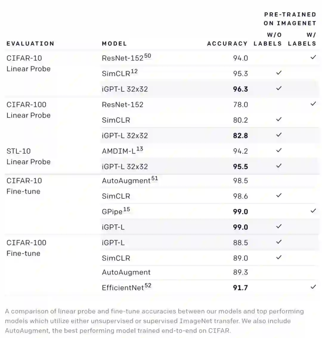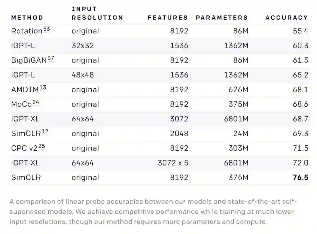 iGPT 和当前最优自监督模型的 linear probe 准确率对比情况。