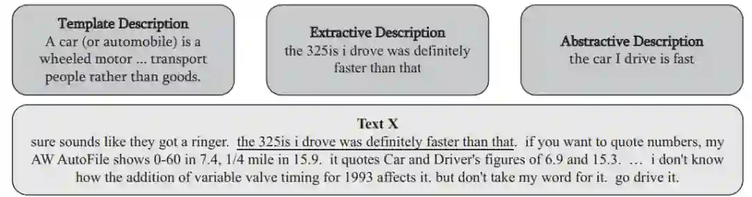 通过不同策略建构的描述类型。文本来自 20news 数据集。