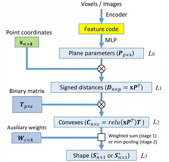 利用这一属性,研究者设计了 BSP-Net,该网络可以通过凸分解来学习表示 3D 形状。重要的是,BSPNet 以无监督方式学得,因为训练过程中不需要凸形分解。该网络的训练目的是,为使用基于一组平面构建的 BSPtree 获得的一组凸面重构形状。经过 BSPNet 推断的凸面可被轻松提取以形成多边形网格,而无需进行等值曲面处理。生成的网格是紧凑的(即低多边形),非常适合表示尖锐的几何形状。此外,它们一定是水密网格,并且可以轻松参数化。