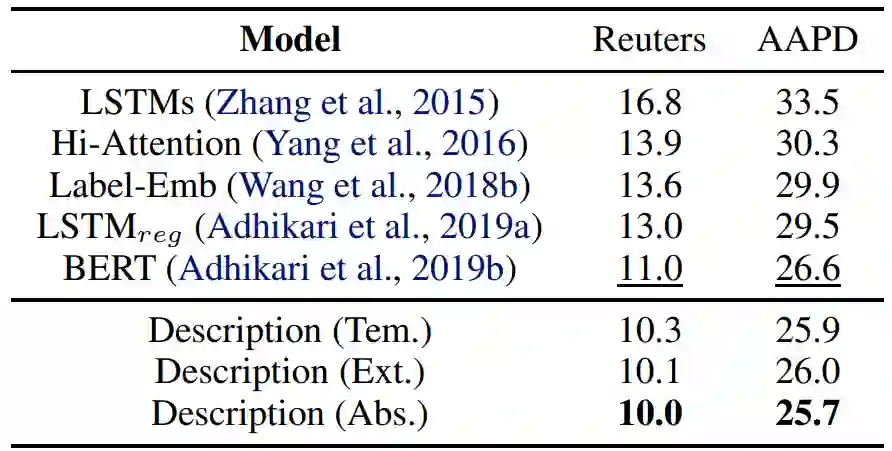 。文本描述可以通过手动模板(handcrafted template)或者使用强化学习摘要式 / 提取式模型来生成。描述和文本的级联被馈入到分类器,以决定当前标签是否应该分类给文本。