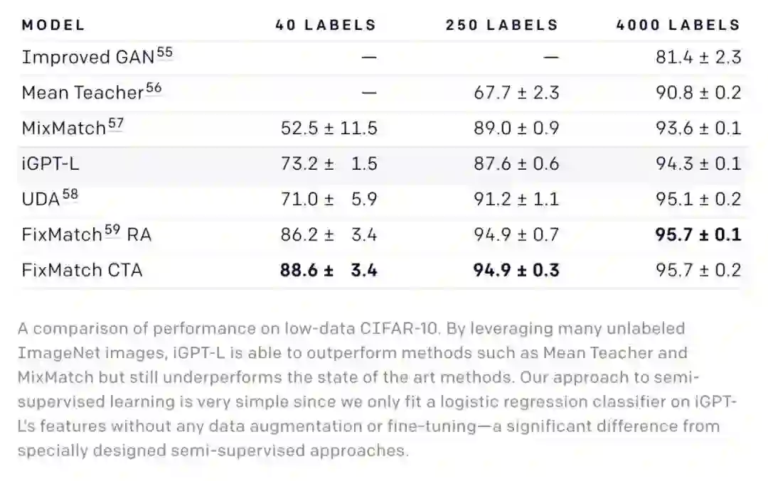 研究者在低数据 CIFAR-10 数据集上对 iGPT-L 进行了评估,结果发现基于非增强图像特征的简单 linear probe 表现优于 Mean Teacher 和 MixMatch,但弱于 FixMatch。