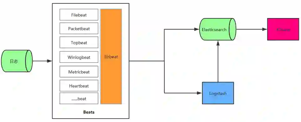 这种架构在日志数据源和 Logstash(或 Elasticsearch) 中增加了 Beats 。Beats 集合了多种单一用途数据采集器,每款采集器都是以用于转发数据的通用库 libbeat 为基石,beat 所占的系统CPU和内存几乎可以忽略不计,libbeat平台还提供了检测机制,当下游服务器负载高或网络拥堵时,会自动降低发生速率。下面的例子我们使用 Filebeat 来对文件日志的收集,其他的 beat 可以忽略。