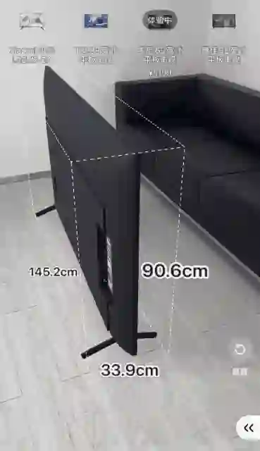 打开手机天猫app,看看这个AR场景,尺寸和效果展示都在,你甚至可以想象坐在沙发上看这个电视的感觉,有点上头是吧?