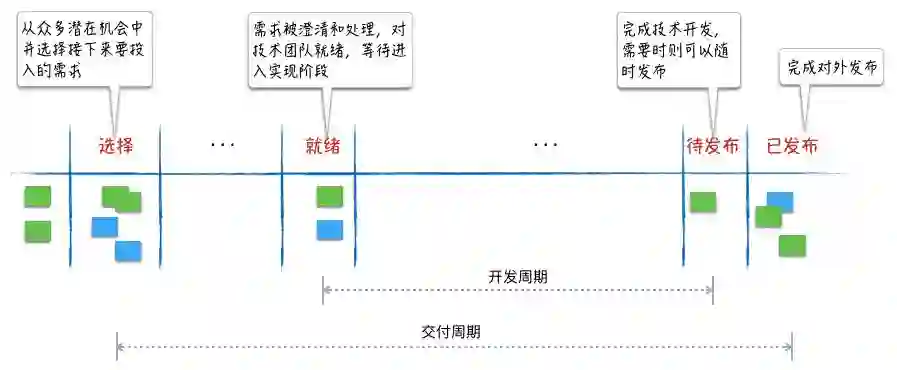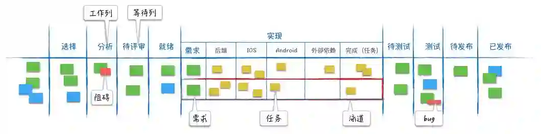 需求在看板上从左至右流动,经过看板上的每个阶段,直至交付。从最左的“选择”列,决定做一个需求开始,直到上线结束。这是一个端到端的过程,拉通了产品、开发、测试、运维等各个前后环节。