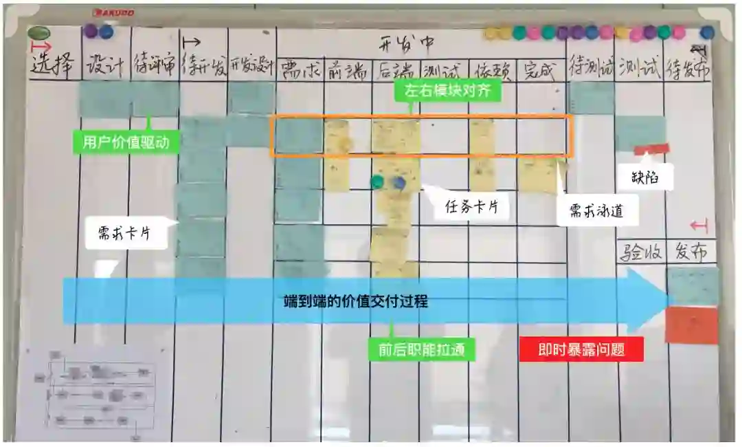 看板的中蓝色卡片是需求,对应可交付的用户价值。让光照亮关键所在,就是要可视化用户价值端到端流动和交付的过程。
