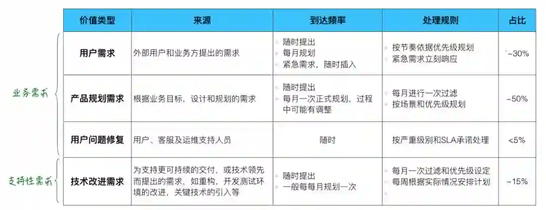 不同的产品和组织,对流动单元的分类不同。上表是某个产品交付团队的需求分类,它区分了需求的类别,其输入的规律及处理的规则等。