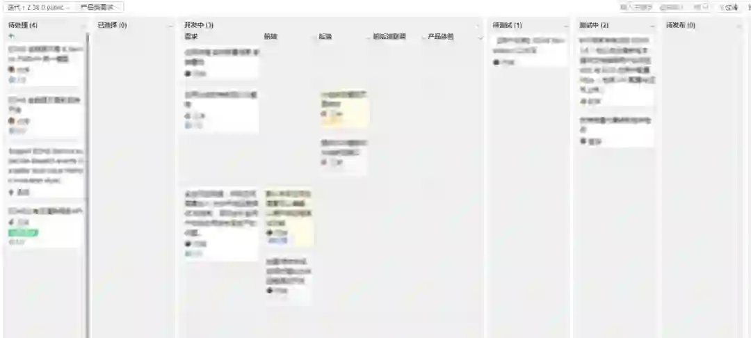 单独看"开发中"这个阶段,需求被分解成为任务——图中黄色纸条。任务与其所属的需求处于同一行,我们称之为泳道。泳道的首列(蓝色纸条)是需求,下属任务(黄色卡片)按模块不同放在各自的列内,如前端、后端、以及外部依赖任务等。运行过程中,同一需求下属的任务尽量对齐进度,快速完成需求。所属的任务全部完成后,需求进入待测试,泳道清空,可以让下一需求进入。