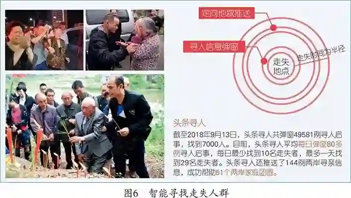 我们将人工智能技术与产品功能相结合,积极服务于公益。“头条寻人”项目致力于帮助寻找走失人群,以走失地点为圆心,行走速度和走失时间的乘积为半径,画一个圆,可以表示出可能的走失范围(如图6所示)。我们利用地理位置等信息,在预估的走失范围内推送寻人信息,实现了每条信息的精准地理范围覆盖和人群触达,从而提高了寻人的成功率。截至2018年9月13日,近两年半的时间内,“头条寻人”弹窗发布了49581例寻人启事,成功寻回7254名走失者,寻回率达到14.63%。9月底,我们也尝试了把寻人与视频载体相结合:运用自动生成视频的技术,输入一条文字版的寻人信息,不到10秒的时间,即可自动生成抖音寻人视频。头条寻人和抖音寻人都是利用AI技术促进信息交流,进而服务公益的产品实践。