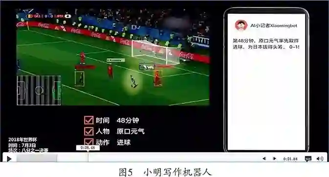 我们以2018年俄罗斯世界杯上日本和比利时的比赛为例介绍小明的写作原理。小明根据出场球员生成对应的身份文字,在关键节点追踪人物的行为动作,包括球员在场上的位置,识别球员是否传球、射门、进球及裁判裁决情况(见图5)。在创作稿件的过程中,小明可以对视频内容进行深度理解,结合网络公开信息生成摘要,并且选出最好的图片作为新闻封面和插图。稿件完成后,通过机器翻译将稿件内容译成葡萄牙语、英语、法语等。智能算法会根据读者的兴趣进行精准推送,把稿件分发给感兴趣的读者,从而让信息更快速有效地满足世界各国用户的需要。