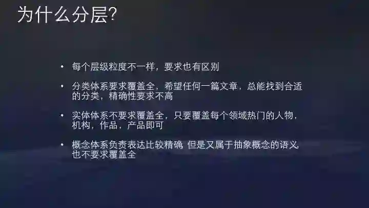 分类的目标是覆盖全面,希望每篇内容每段视频都有分类;而实体体系要求精准,相同名字或内容要能明确区分究竟指代哪一个人或物,但不用覆盖很全。概念体系则负责解决比较精确又属于抽象概念的语义。这是我们最初的分类,实践中发现分类和概念在技术上能互用,后来统一用了一套技术架构。