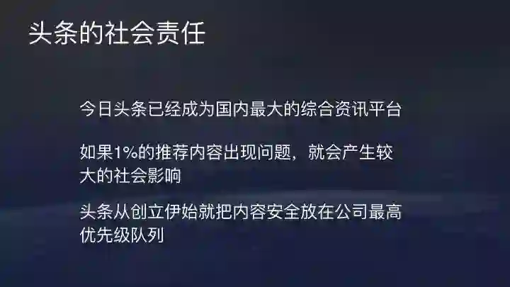 最后要介绍今日头条在内容安全上的一些举措。头条现在已经是国内最大的内容创作与分发凭条,必须越来越重视社会责任和行业领导者的责任。如果1%的推荐内容出现问题,就会产生较大的影响。