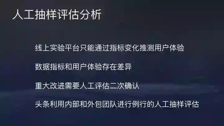 当然,只有实验平台是远远不够的。线上实验平台只能通过数据指标变化推测用户体验的变化,但数据指标和用户体验存在差异,很多指标不能完全量化。很多改进仍然要通过人工分析,重大改进需要人工评估二次确认。