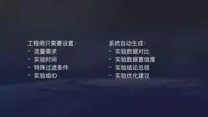 在这个系统下工程师只需要设置流量需求、实验时间、定义特殊过滤条件,自定义实验组ID。系统可以自动生成:实验数据对比、实验数据置信度、实验结论总结以及实验优化建议。