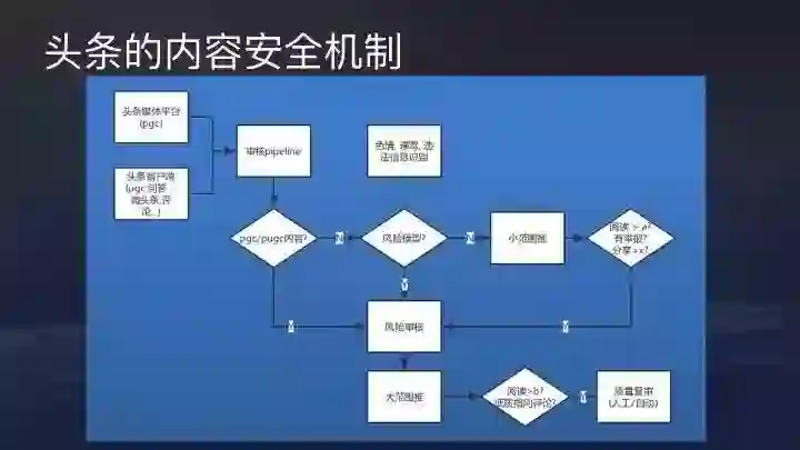 现在,今日头条的内容主要来源于两部分,一是具有成熟内容生产能力的PGC平台,一是UGC用户内容,如问答、用户评论、微头条。这两部分内容需要通过统一的审核机制。如果是数量相对少的PGC内容,会直接进行风险审核,没有问题会大范围推荐。UGC内容需要经过一个风险模型的过滤,有问题的会进入二次风险审核。审核通过后,内容会被真正进行推荐。这时如果收到一定量以上的评论或者举报负向反馈,还会再回到复审环节,有问题直接下架。整个机制相对而言比较健全,作为行业领先者,在内容安全上,今日头条一直用最高的标准要求自己。