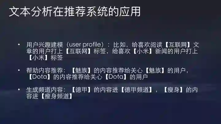 内容分析包括文本分析,图片分析和视频分析。头条一开始主要做资讯,今天我们主要讲一下文本分析。文本分析在推荐系统中一个很重要的作用是用户兴趣建模。没有内容及文本标签,无法得到用户兴趣标签。举个例子,只有知道文章标签是互联网,用户看了互联网标签的文章,才能知道用户有互联网标签,其他关键词也一样。