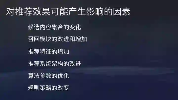 事实上,很多因素都会影响推荐效果。比如侯选集合变化,召回模块的改进或增加,推荐特征的增加,模型架构的改进在,算法参数的优化等等,不一一举例。评估的意义就在于,很多优化最终可能是负向效果,并不是优化上线后效果就会改进。