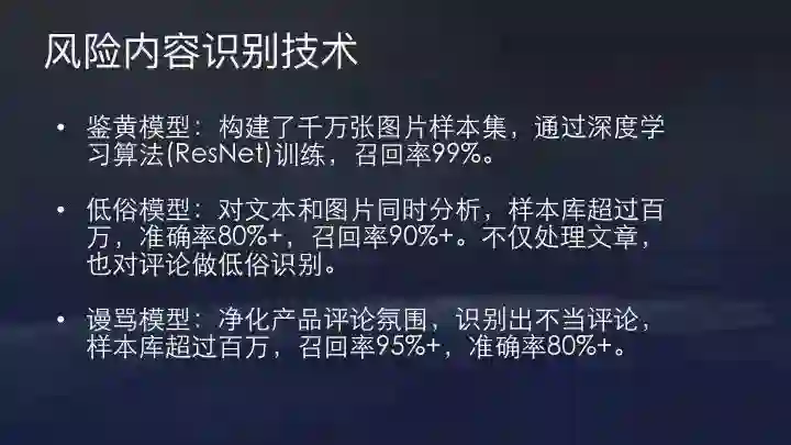 分享内容识别技术主要鉴黄模型,谩骂模型以及低俗模型。今日头条的低俗模型通过深度学习算法训练,样本库非常大,图片、文本同时分析。这部分模型更注重召回率,准确率甚至可以牺牲一些。谩骂模型的样本库同样超过百万,召回率高达95%+,准确率80%+。如果用户经常出言不讳或者不当的评论,我们有一些惩罚机制。