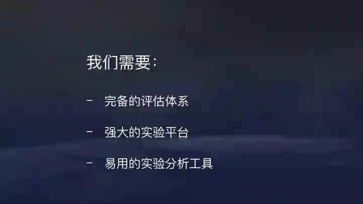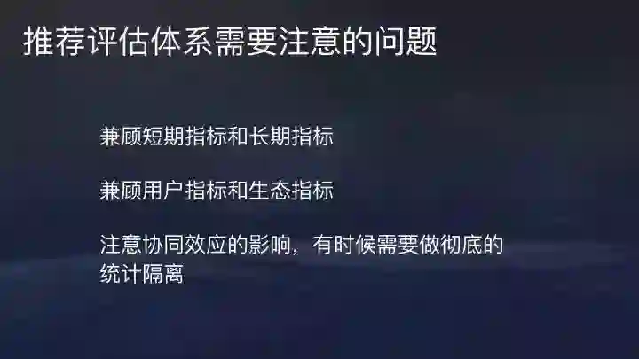 全面的评估推荐系统,需要完备的评估体系、强大的实验平台以及易用的经验分析工具。所谓完备的体系就是并非单一指标衡量,不能只看点击率或者停留时长等,需要综合评估。过去几年我们一直在尝试,能不能综合尽可能多的指标合成唯一的评估指标,但仍在探索中。目前,我们上线还是要由各业务比较资深的同学组成评审委员会深入讨论后决定。