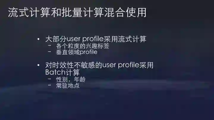 当然,我们也发现并非所有用户标签都需要流式系统。像用户的性别、年龄、常驻地点这些信息,不需要实时重复计算,就仍然保留daily更新。