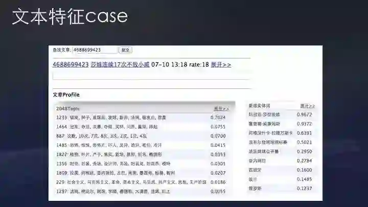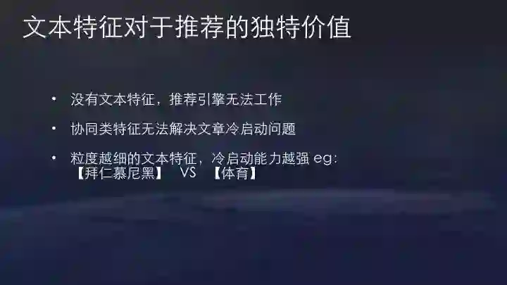 上图是今日头条的一个实际文本case。可以看到,这篇文章有分类、关键词、topic、实体词等文本特征。当然不是没有文本特征,推荐系统就不能工作,推荐系统最早期应用在Amazon,甚至沃尔玛时代就有,包括Netfilx做视频推荐也没有文本特征直接协同过滤推荐。但对资讯类产品而言,大部分是消费当天内容,没有文本特征新内容冷启动非常困难,协同类特征无法解决文章冷启动问题。