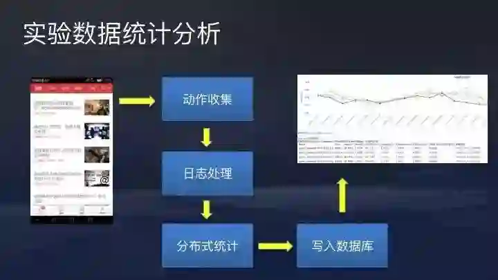 实验过程中用户动作会被搜集,基本上是准实时,每小时都可以看到。但因为小时数据有波动,通常是以天为时间节点来看。动作搜集后会有日志处理、分布式统计、写入数据库,非常便捷。