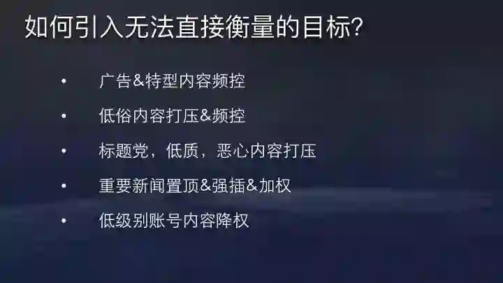 推荐模型中,点击率、阅读时间、点赞、评论、转发包括点赞都是可以量化的目标,能够用模型直接拟合做预估,看线上提升情况可以知道做的好不好。但一个大体量的推荐系统,服务用户众多,不能完全由指标评估,引入数据指标以外的要素也很重要。