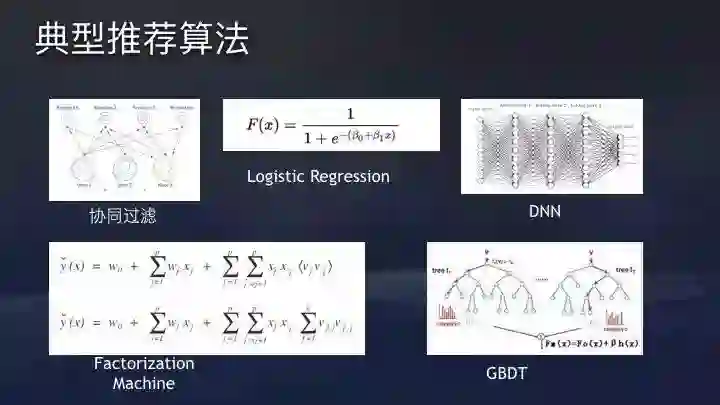 前面提到的公式y = F(Xi ,Xu ,Xc),是一个很经典的监督学习问题。可实现的方法有很多,比如传统的协同过滤模型,监督学习算法Logistic Regression模型,基于深度学习的模型,Factorization Machine和GBDT等。
