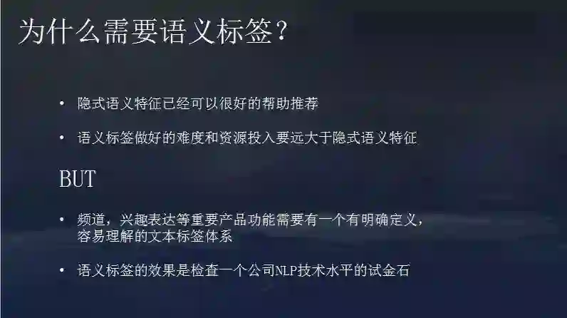 目前,隐式语义特征已经可以很好的帮助推荐,而语义标签需要持续标注,新名词新概念不断出现,标注也要不断迭代。其做好的难度和资源投入要远大于隐式语义特征,那为什么还需要语义标签?有一些产品上的需要,比如频道需要有明确定义的分类内容和容易理解的文本标签体系。语义标签的效果是检查一个公司NLP技术水平的试金石。