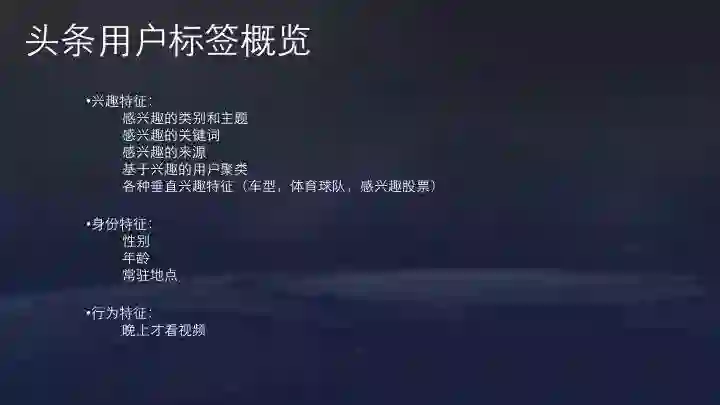 今日头条常用的用户标签包括用户感兴趣的类别和主题、关键词、来源、基于兴趣的用户聚类以及各种垂直兴趣特征(车型,体育球队,股票等)。还有性别、年龄、地点等信息。性别信息通过用户第三方社交账号登录得到。年龄信息通常由模型预测,通过机型、阅读时间分布等预估。常驻地点来自用户授权访问位置信息,在位置信息的基础上通过传统聚类的方法拿到常驻点。常驻点结合其他信息,可以推测用户的工作地点、出差地点、旅游地点。这些用户标签非常有助于推荐。
