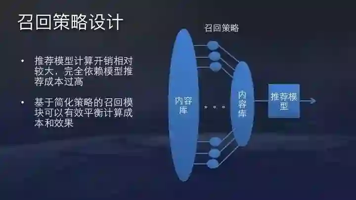 但因为头条目前的内容量非常大,加上小视频内容有千万级别,推荐系统不可能所有内容全部由模型预估。所以需要设计一些召回策略,每次推荐时从海量内容中筛选出千级别的内容库。召回策略最重要的要求是性能要极致,一般超时不能超过50毫秒。