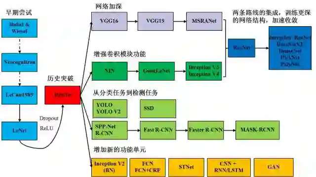 以卷积神经网络为例,我们用图2来展示入门需要掌握的知识。起点是Hubel和Wiesel的对猫的视觉皮层的研究,再到日本学者福岛邦彦神经认知机模型(已经出现了卷积结构),但是第一个CNN模型诞生于1989年,1998年诞生了后来被大家熟知的LeNet。随着ReLU和Dropout的提出,以及GPU和大数据所带来的历史机遇,CNN在2012年迎来了历史性的突破——诞生了AlexNet网络结构。2012年之后,CNN的演化路径可以总结为四条: