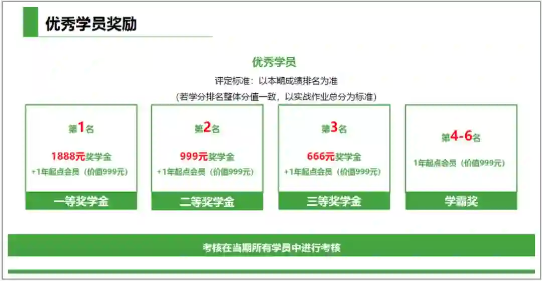 最后,要给大家安利的是:课程还安排了丰厚的优秀学员奖励,按时按质完成7次大作业+1次答辩,排名前三可立返现金!最高获1888元奖金+1年起点会员(价值999元)!