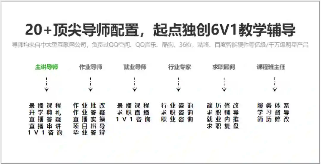 为此,特训营课程的导师团集合了20+位顶尖导师,他们均来自一线互联网大厂,配备了主讲导师、作业导师、就业导师、行业专家、班主任、助教等6个重要角色。