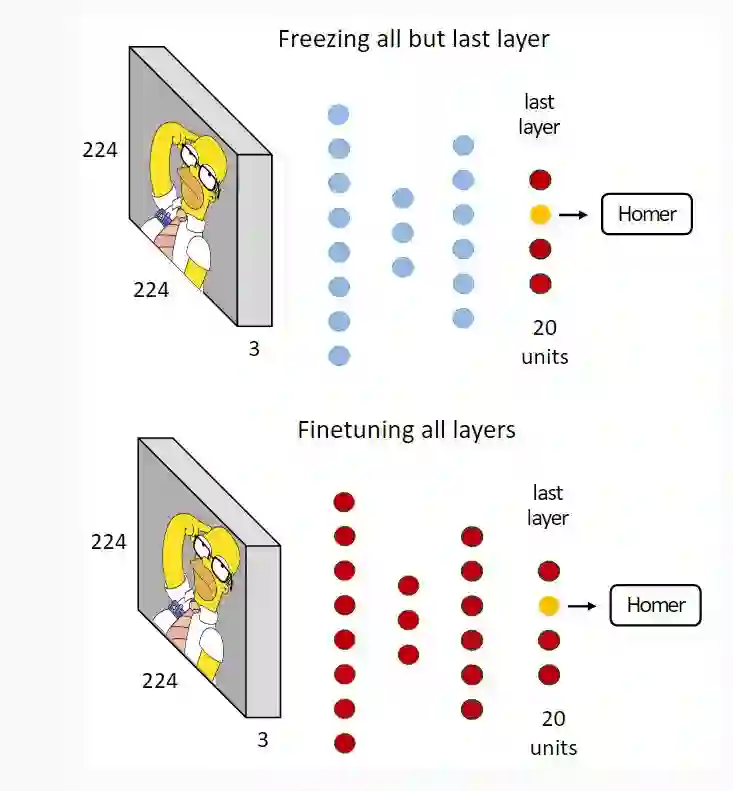 在下图中,我们可以看到上述提到的两种迁移学习策略。我们在 ImageNet 上使用了一个预训练的 CNN,并将 Simpsons 数据集的子集 Homer Simpson 作为目标集,用该网络对其进行分类。这个子集包含 20 个类,每个类有 300-1000 个图像。