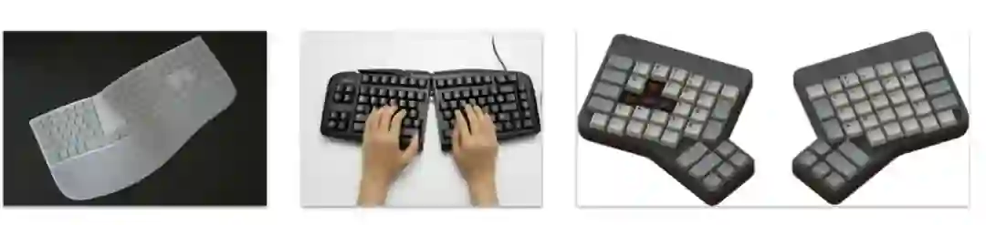 从左到右分别为弧面状、可调节以及分体式人体工学键盘
