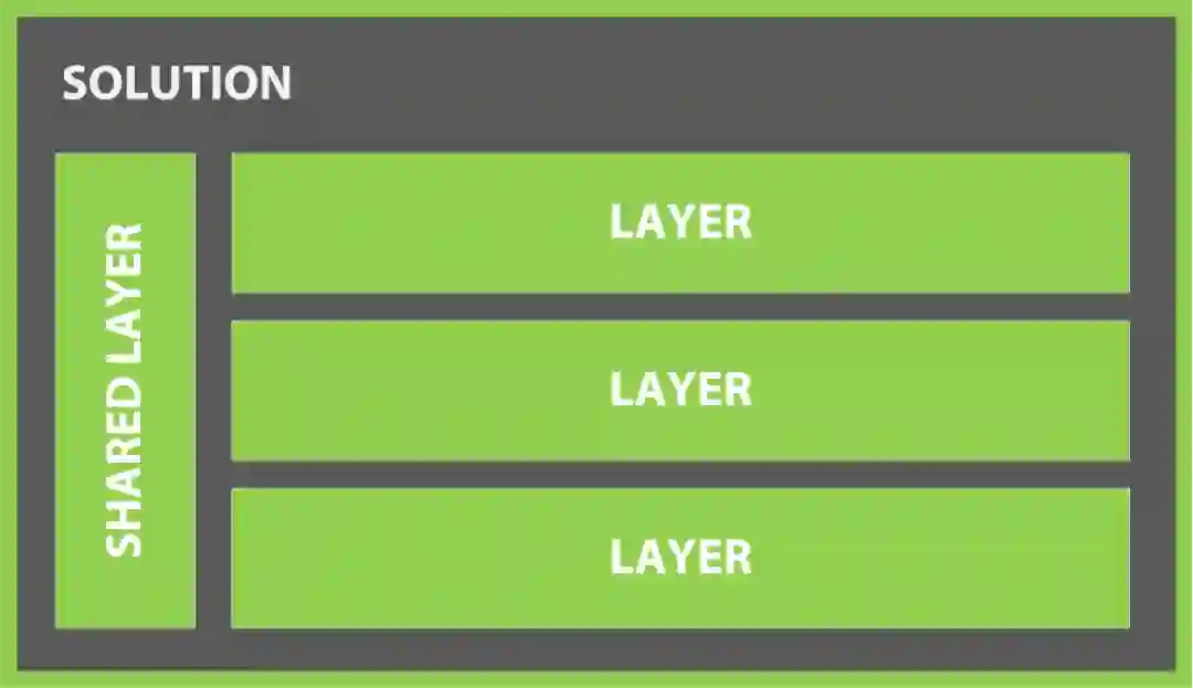 除了抽象,分层也是我们应对和管理复杂性的基本思维武器,如下图,为了构建一套复杂系统,我们把整个系统划分成若干个层次,每一层专注解决某个领域的问题,并向上提供服务。有些层次是纵向的,它贯穿所有其它层次,称为共享层。分层也可以认为是抽象的一种方式,将系统抽象分解成若干层次化的模块。