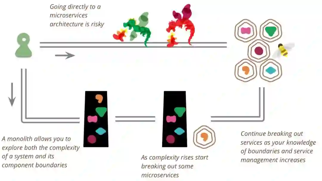 上面的路线是一开始就直奔微服务架构,其实背后体现的是设计式架构的思维,认为架构师可以完全设计整个系统和它的演化方向。马丁认为这种做法风险非常高,一个是成本高昂,另外一个是刚开始架构师对业务域理解不深,无法清晰划分领域边界,开发出来的系统很可能无法满足用户需求。