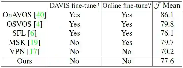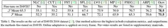 表1:在DAVIS 2016数据集的评价结果。 提出的方法在两个评估指标上都达到了最高水平,并且胜过了在DAVIS上进行微调的方法。每个视频的结果放在文末的补充材料中。