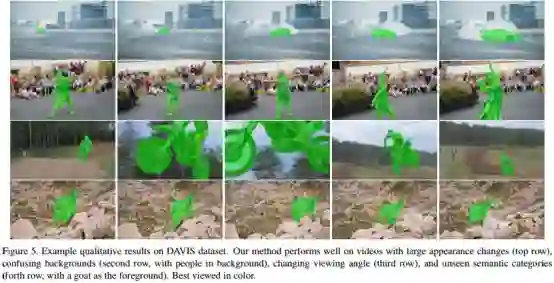图5:在DAVIS数据集的定性结果示例。 提出的方法对于外观变化大的视频(第一行),混淆的背景(第二行,有人在背景中),视角变化(第三行,不同的视角)和看不见的语义类别(第四行,以山羊为前景)具有较好的效果。